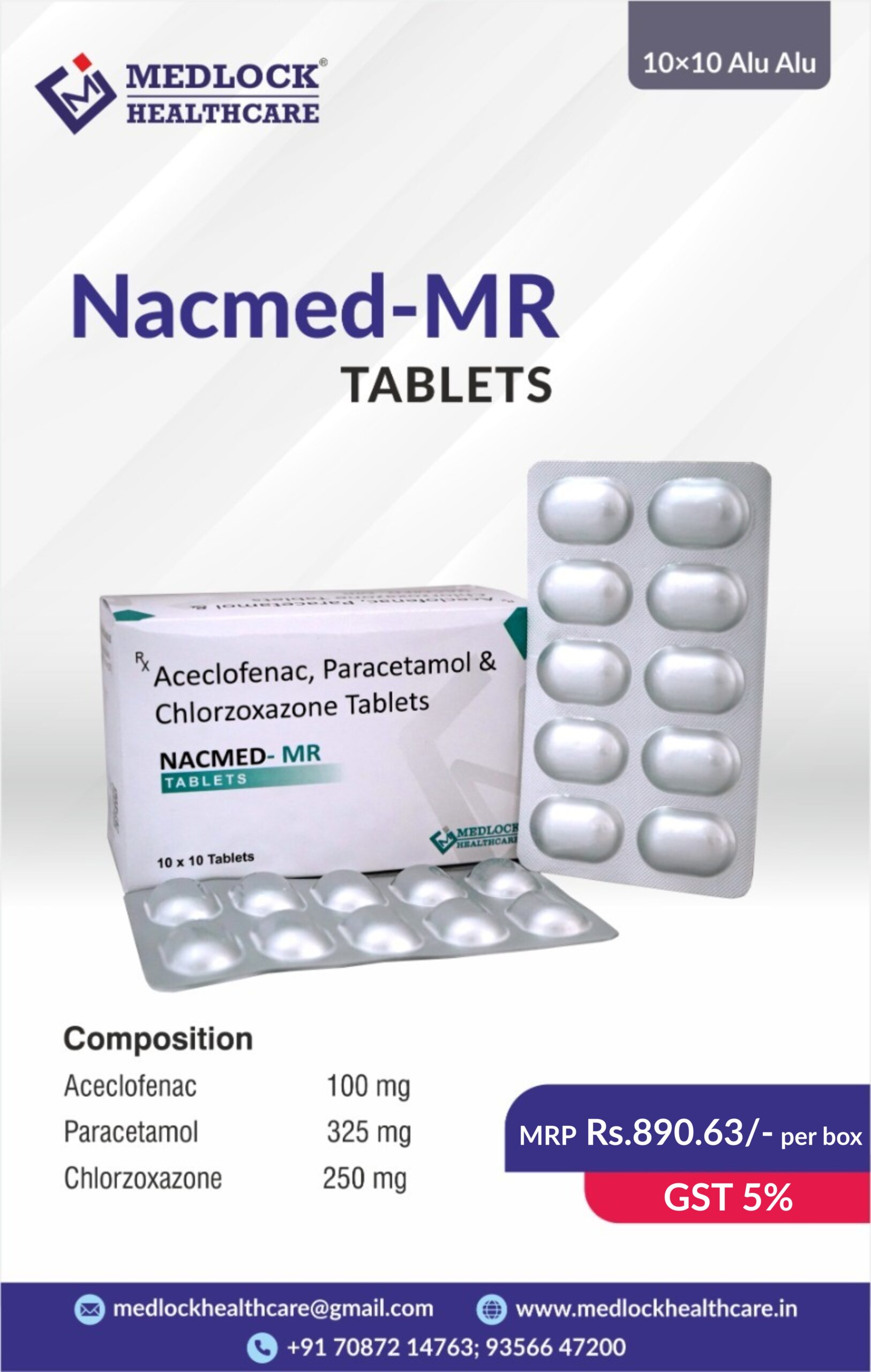 Aceclofenac+ Paracetamol+ Chlorozoxazone Tablet – This tablet is an amalgamation of three molecules i.e., Aceclofenac, Paracetamol, and Chlorzoxazone. Aceclofenac is used to ease pain and inflammations in conditions of osteoarthritis, rheumatoid arthritis, ankylosing spondylitis, etc. Paracetamol is a painkiller that is used to cure pain and can also be used to reduce fever. Chlorzoxazone is used to reduce pain and stiffness that is caused due to muscle strain and sprain. All these three medications have their own different properties which combine with each other and come up with a tablet which is known as NACMED-MR Tablet available at Medlock Healthcare.