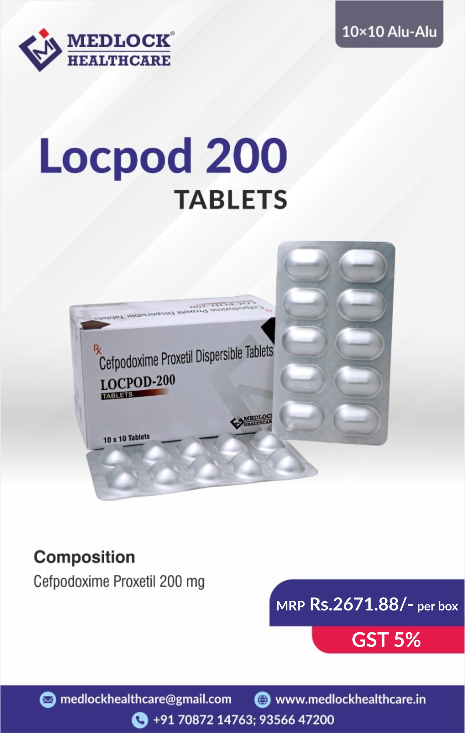 Cefpodoxime tablets are available under the brand name LOCPOD-200 which is manufactured by Medxone Healthcare and offers to treat a wide variety of bacterial infections. It works by stopping the growth of bacteria. This antibiotic is used for the effective treatment of bacterial infections. These tablets are available in 200mg dosages.