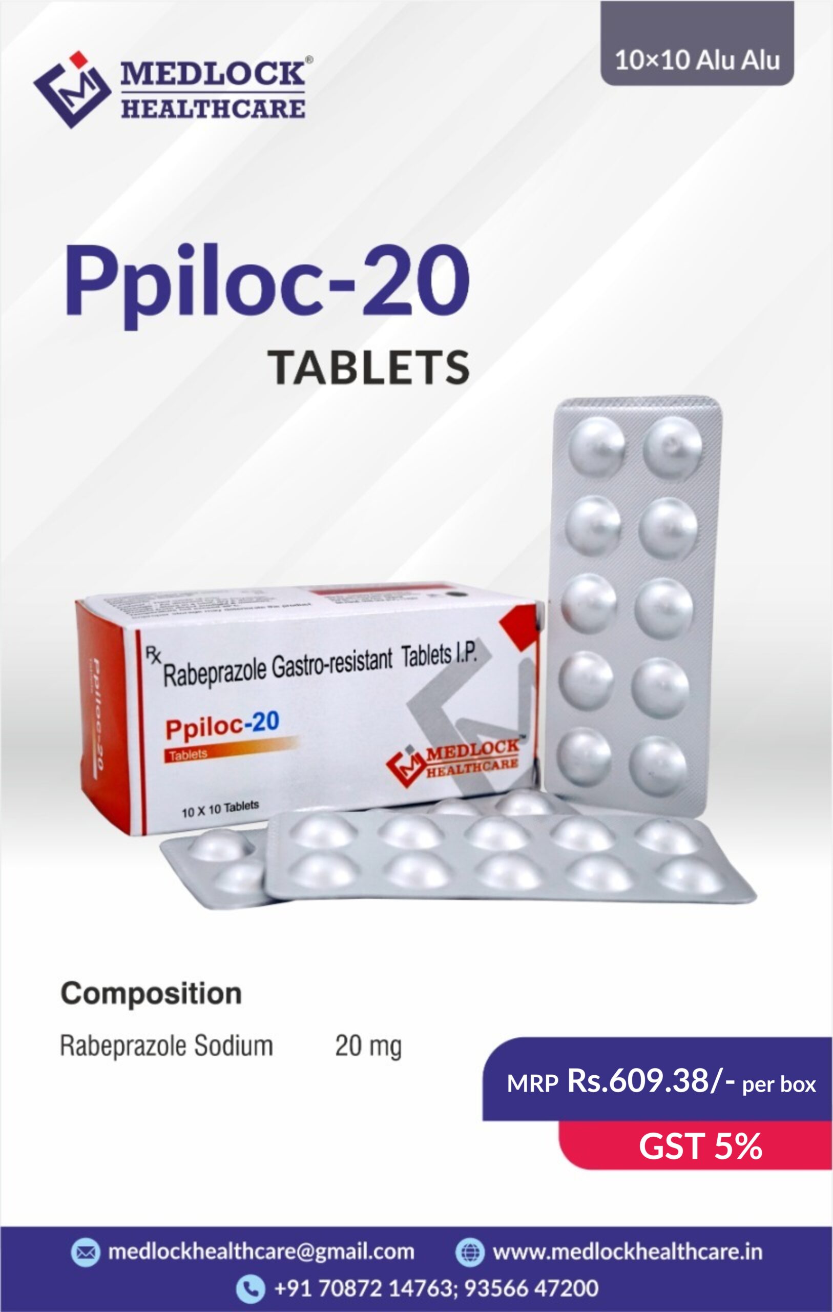 Rabeprazole 20 mg tablets are used in the treatment of gastroesophageal reflux disease (GERD), a condition in which the backward flow of acid from the stomach causes heartburn and possible injury of the esophagus (the tube that connects the throat and stomach). Medlock Healthcare is the leading manufacturer and supplier of Rabeprazole 20 mg tablets. The medication is delivered under the brand name PPILOC-20. The medication is prepared using the best quality raw materials to enhance the efficacy of the medicines. Medlock Healthcare also offers PCD pharma franchise and third-party manufacturing services to interested pharma professionals and distributors. The tablets are delivered in the packaging style of 10X10 Alu-Alu to ensure longer shelf life.